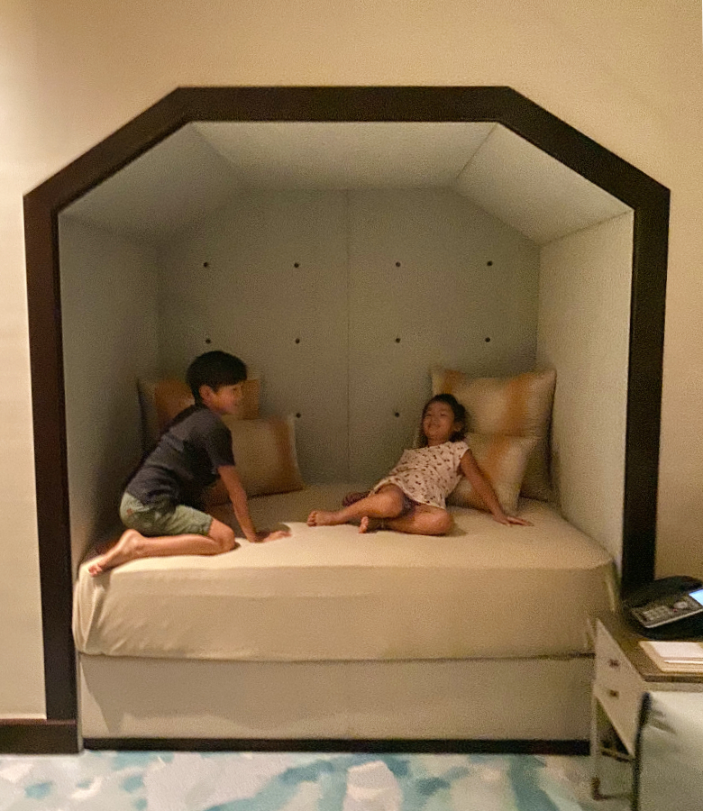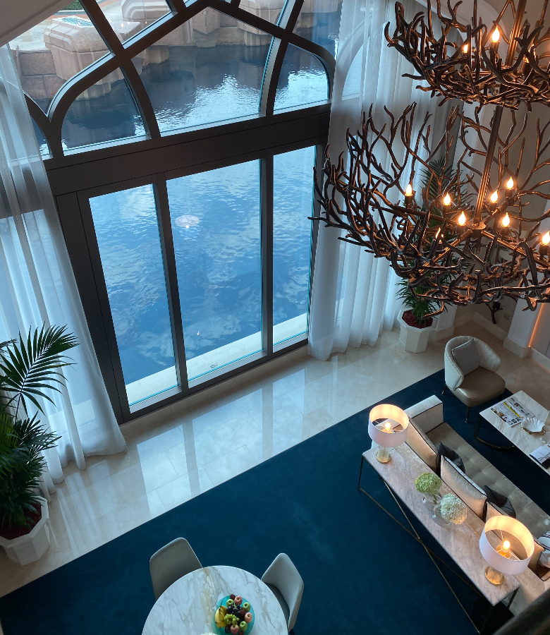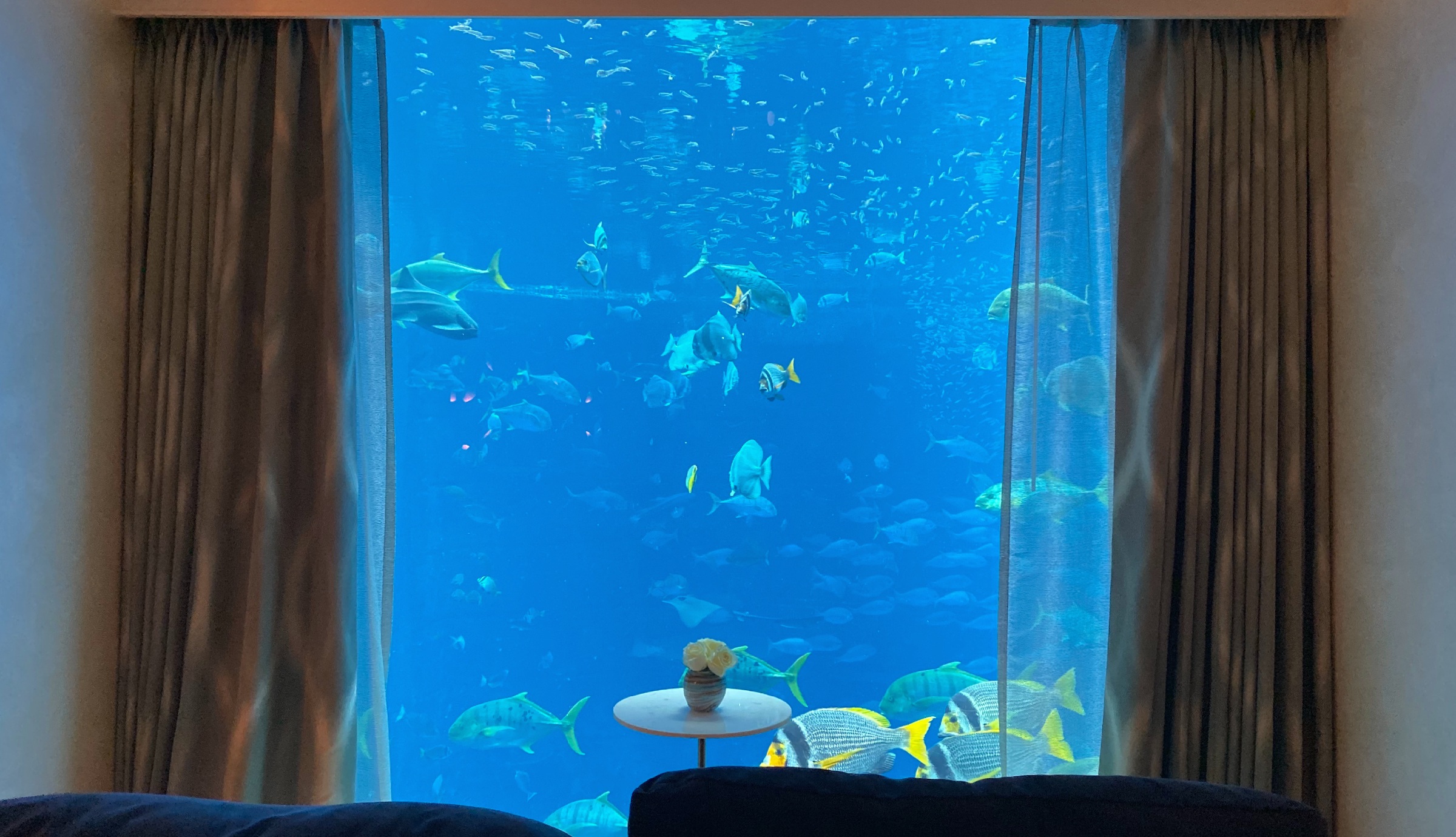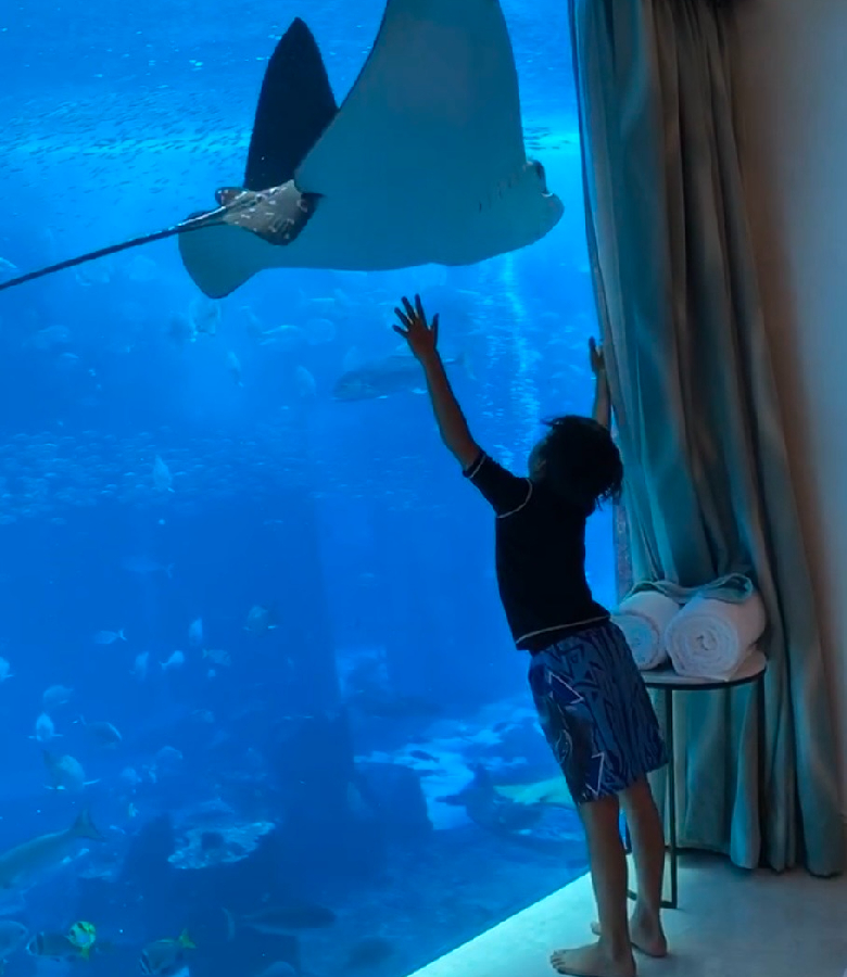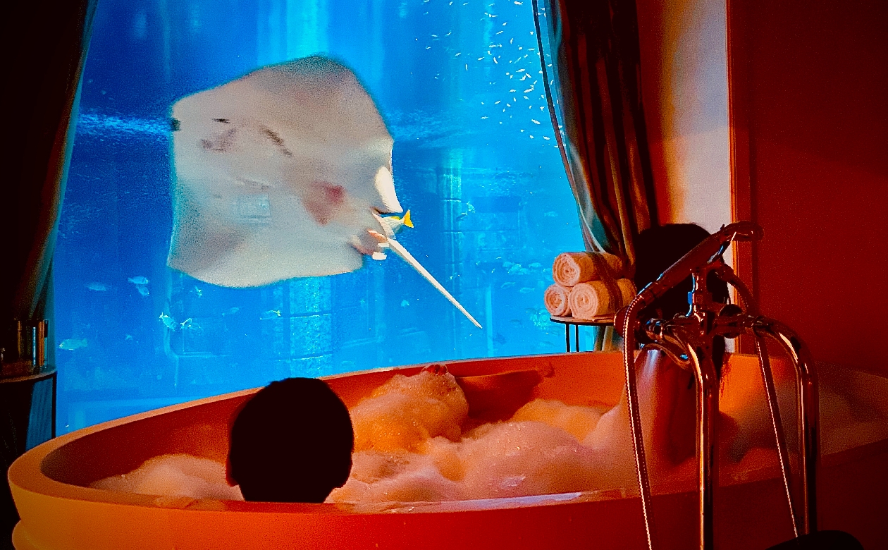 泊まった部屋はエレベーター付きの大きなメゾネットフロア。インテリアは砂と海をイメージしたカラーパレットでまとめられ、バスルームには大理石や御影石が贅沢に用いられています。マスターベッドルームとバスルームでは、床から天井までの一面の窓越しにアクアリウムが広がります。優雅に泳ぎ回る水棲生物たちは、一日中眺めていても飽きません。水族館が好きな人には堪らないでしょう。