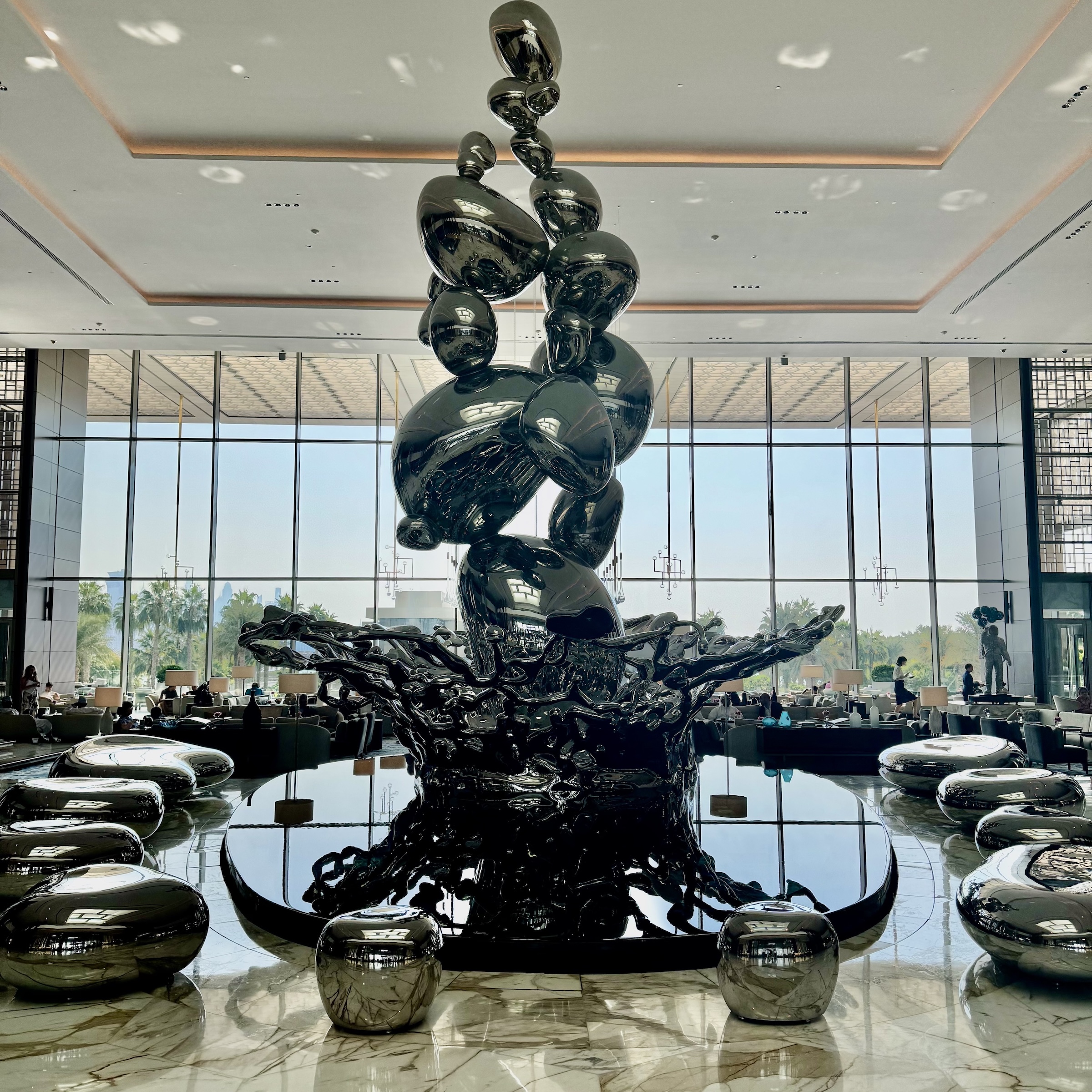 外観だけでなく館内にも驚きが詰まっています。エントランスでは、砂漠に降る最初の雨粒を象徴する巨大なスチール彫刻「Droplets」が宿泊者を迎え、世界最大級のクラゲの水槽、ホテルの中庭で繰り広げられる水と炎を組み合わせた噴水ショー「Skyblaze Fountain」など、さまざまな仕掛けが滞在体験を彩ります。