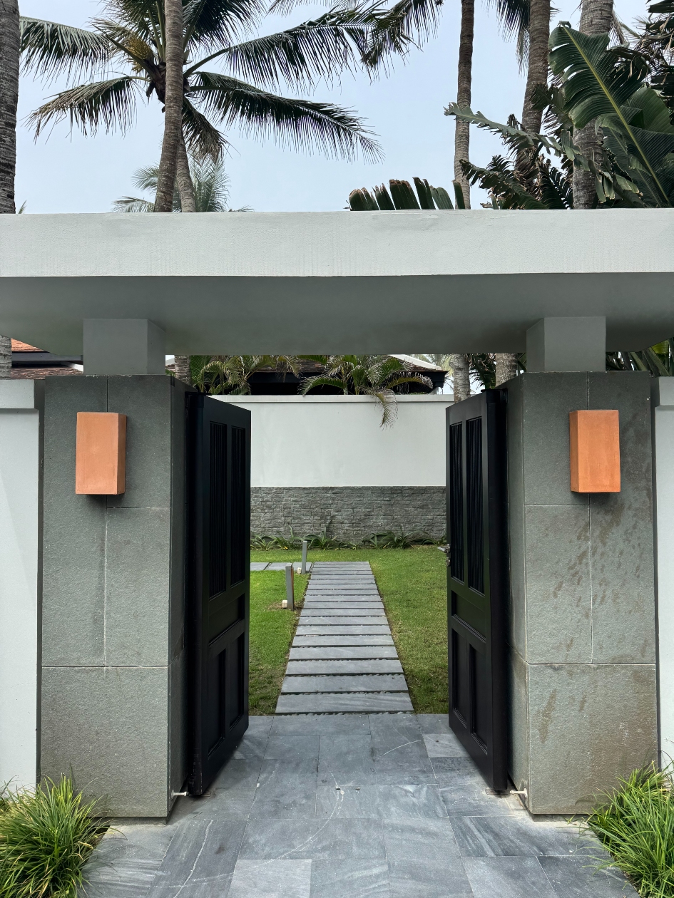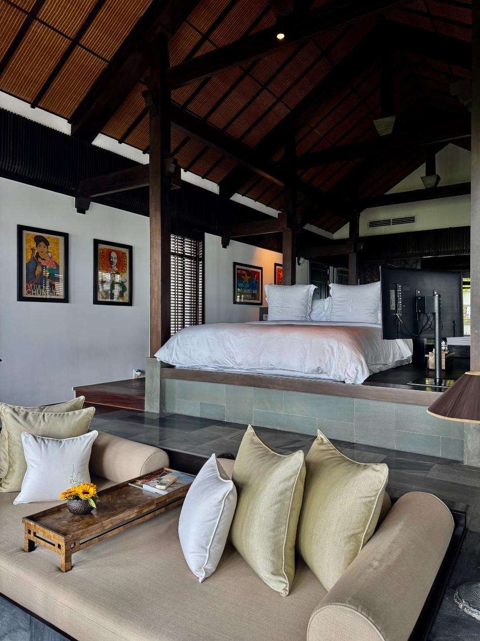 客室すべてがヴィラ形式であることもThe Nam Hai の大きな特徴。画一的なゲストルームではなく、それぞれが独自性を持ったヴィラが、広大な敷地内に約100棟も点在しています。ヴィラの設計には、ベトナムの伝統や自然、中国や東南アジアに伝わる風水思想が取り入れられ、屋内外の調和を意識した造りが魅力です。ヴィラ群は豊かな緑と海を包み込むように配置され、自然との一体感を感じられます。私が泊まったのはオーシャンビューのプール付きヴィラ。3つの施設から構成されている贅沢なつくりで、ユニークな間取りが印象的でした。