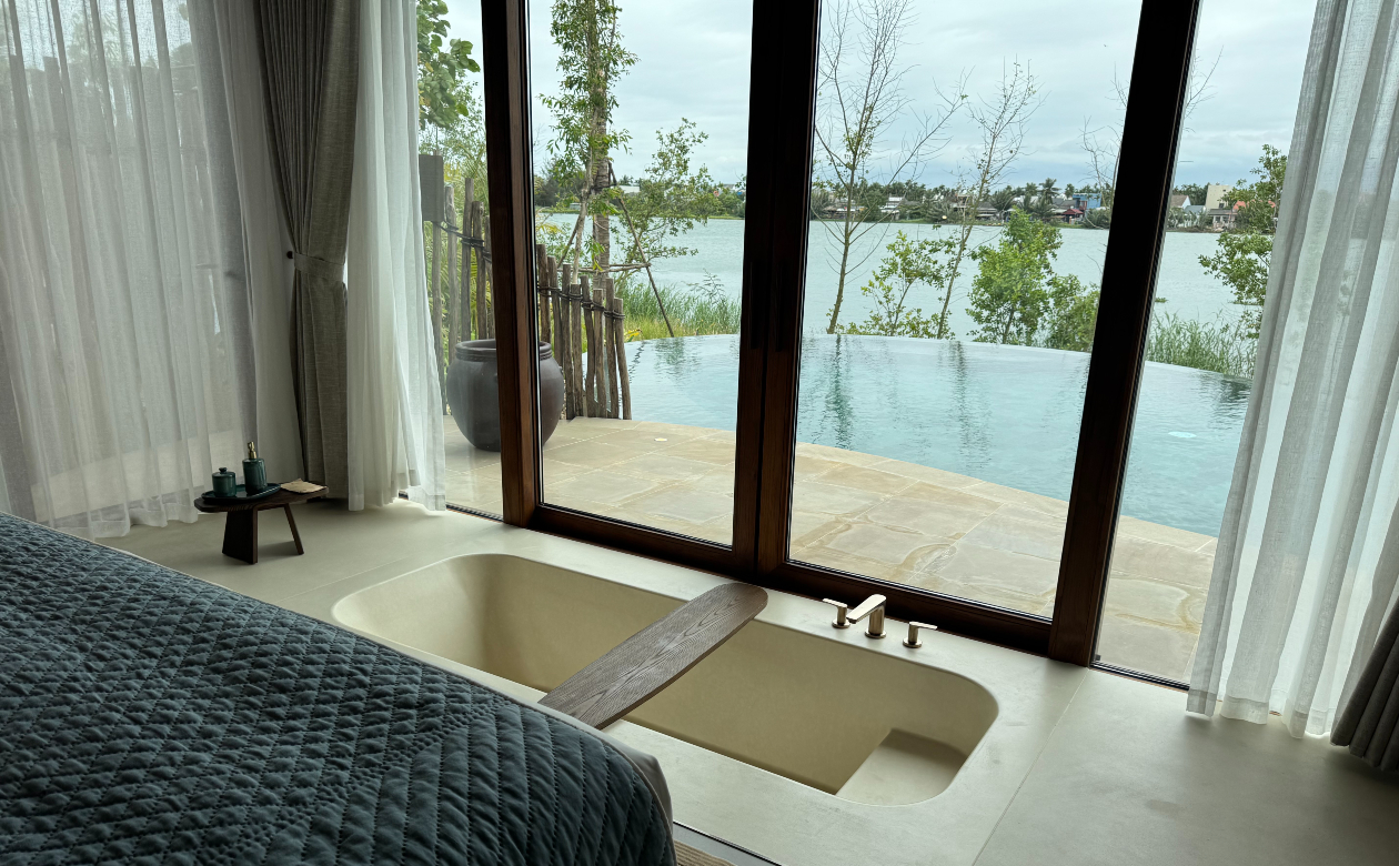 60ある客室はすべてヴィラ形式。トゥボン川の流れに沿って絶妙にレイアウトされています。建物自体を高床式にしつつ木質構造を取り入れることで、自然環境を残した上で洪水や潮位の変化にも対応するサステナブルな作りとなっています。ヴィラ一棟はそこまで広いわけではありませんが、すべてにプライベートプールが備わり、自然素材を生かした家具やゲストルームと屋外デッキに連続性を持たせたでデザインが目に止まります。シャワー&トイレやバスの配置には思わず「上手い!」と唸ってしまいました。